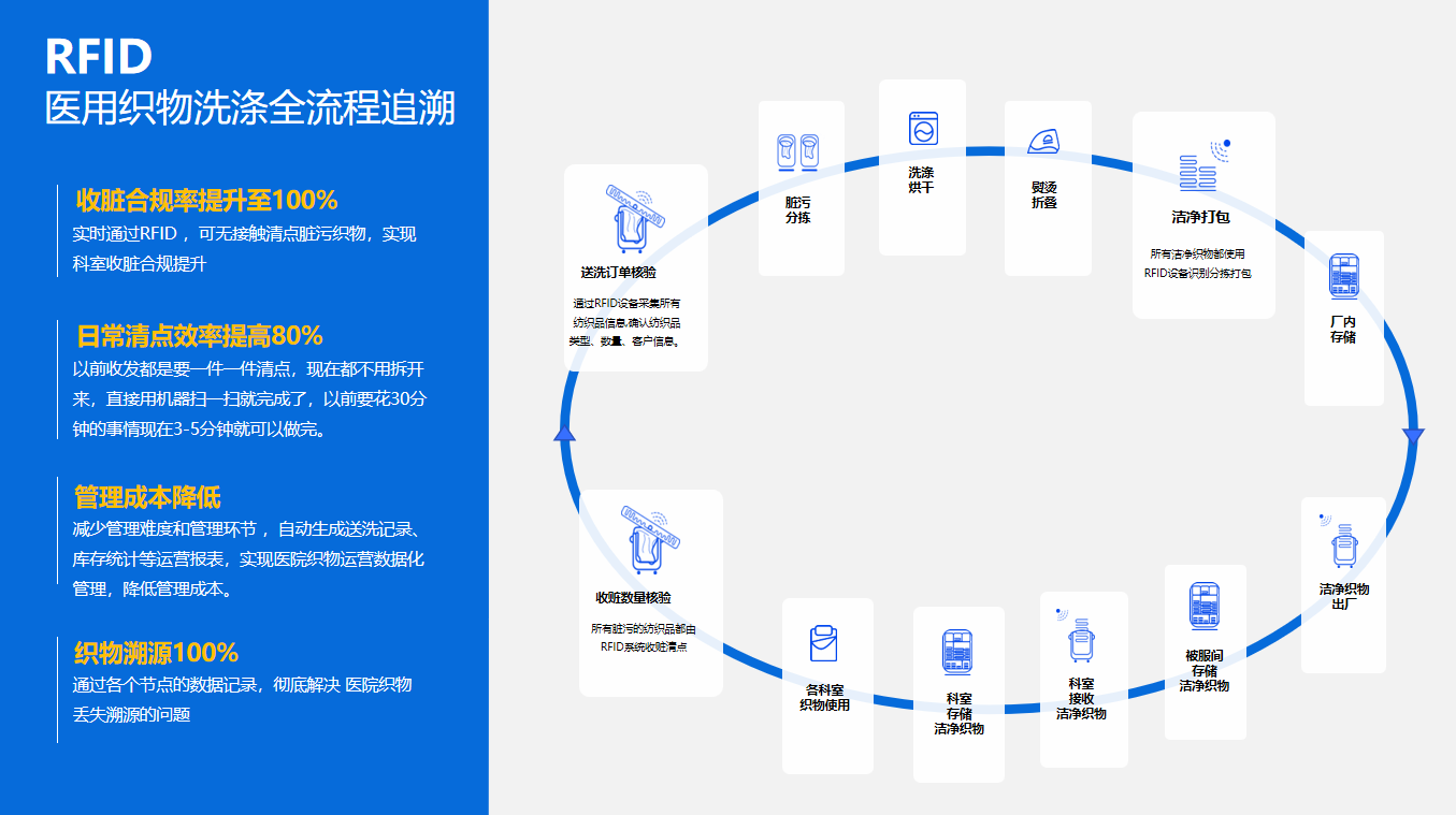 產(chǎn)品簡介: 在醫(yī)療后勤升級的浪潮中,“布草管理” 正從 “后端配角” 變?yōu)?“院感防控主角”。隨著省衛(wèi)健委對醫(yī)用織物洗滌消毒 “全鏈條追溯” 要求的強化,以及合肥、蕪湖、蚌埠等區(qū)域醫(yī)療中心的建設(shè),傳統(tǒng) “人工記錄 + 模糊追溯” 的布草管理模式,已無法滿足三甲醫(yī)院、基層衛(wèi)生院的差異化需求 —— 要么因追溯斷層被通報整改,要么因效率低下錯失訂單, 醫(yī)療洗滌企業(yè)正面臨 “不升級就淘汰” 的壓力。 而達(dá)一達(dá) “一芯到底” RFID 布草管理模式的出現(xiàn),徹底打破了這一困境。通過 “給每件布草植入一枚 RFID 芯片,貫穿從生產(chǎn)、洗滌到報廢的全生命周期”,該模式不僅幫洗滌企業(yè)打通了 “合規(guī)追溯” 的堵點,更適配了 “省域集中洗滌 + 基層分散服務(wù)” 的醫(yī)療布局,成為當(dāng)?shù)夭疾莨芾淼?“標(biāo)配方案”。接下來,我們通過達(dá)一達(dá)與某頭部洗滌企業(yè)的合作案例,拆解 “一芯到底” 如何落地為 “區(qū)域范本”。