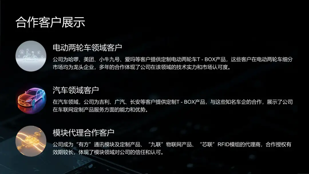 為客戶提供國產(chǎn)化芯片開發(fā)的物聯(lián)通訊模組及定制化配套解決方案,具備最優(yōu)性價比。且多年積累了細(xì)分市場的長期穩(wěn)定龍頭客戶。